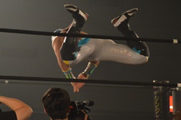 グルクンボディスラム、ロープに飛んでサマーソルトドロップ(右写真)、カウント2。高井にタッチ。