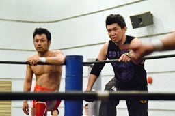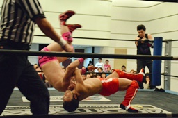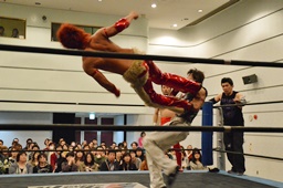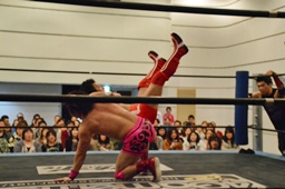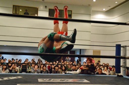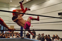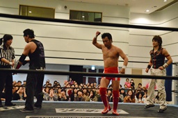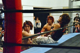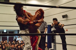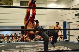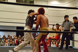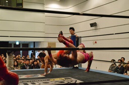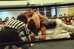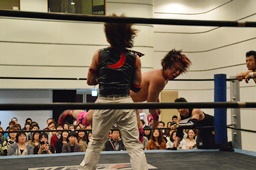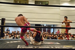 谷口入ってダブルのブレーンバスター(右写真)、谷口がカバー、カウント2。