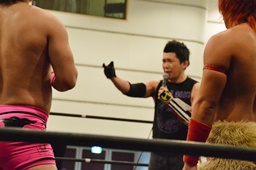 藤田ミノルが「おいDDT!いったい誰の許可取って北九州で興行やってんだぁ!全然聞いてねえぞ!」と因縁(右写真)。