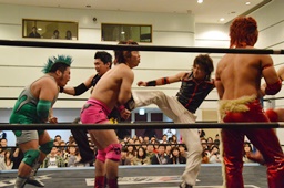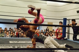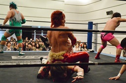 高尾が凛音にボディスラムから片逆エビ、石井と入江がカットを阻止せんと身構える(右写真)。凛音自力でロープ。5分経過。