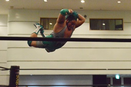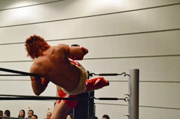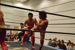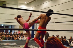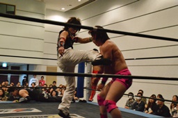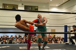 高尾ガットショット連打、ロープに振ってドロップキック(左写真)、カウント2。