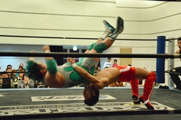 凛音ボディスラムからコーナーに上ってムーンサルトプレス、石井かわす(左写真)。