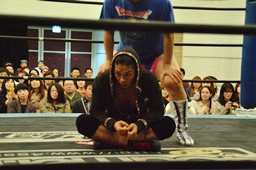 坂口ローキック連打、彰人は床運動のようにマットの上で回転(左写真)、