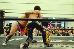 坂口彰人にヒザ蹴り、しかしまたディーノに捕まる(右写真)。レフェリーが「ノータッチじゃないか?」と言うとディーノ「タッチしてます。」