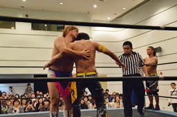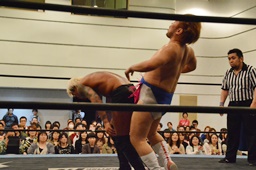 ディーノ坂口に男色スープレックス(左写真)からシャイニングあてがい、