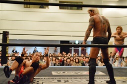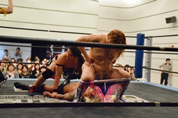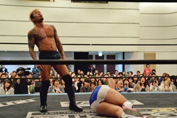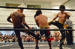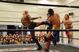 ディーノストンピング、ナイトメア(左写真)、KUDOが彰人を蹴ってカット、彰人ディーノにぶつかる、ディーノ坂口の顔面に座る、カウント2。