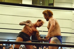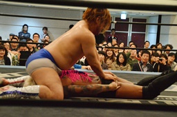 彰人ダブルアームの体勢、坂口ブロック、彰人は自軍コーナーに。ディーノは「(KUDOを)下げろ下げろ!」と言いながら坂口のタイツを下げる(右写真)。