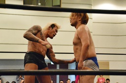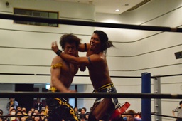 KUDOと彰人にらみ合いからエルボーの打ち合い(左写真)、