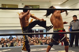 彰人コーナーに振って串刺しエルボー、ロープに飛ぶ、坂口カウンターのミドルキック(右写真)。
