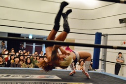コーナーに上ってダイビングダブルニーアタック(右写真)、カウント2。