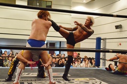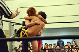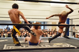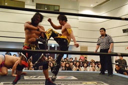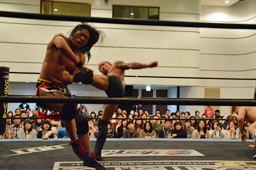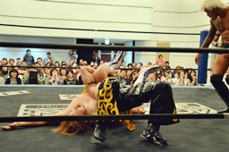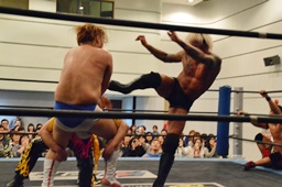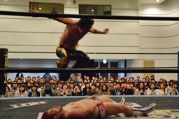 KUDOコーナーに上ってダイビングダブルニードロップ(右写真)、カウント3。