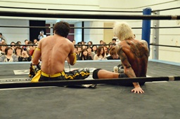 KUDOブレークしてバックスピンキック、彰人キャッチ(右写真)、