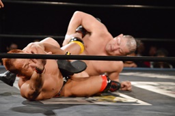 アキレス腱固めに行くが鈴木は舌を出す(左写真)。