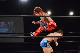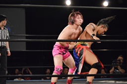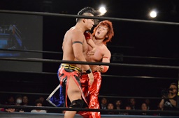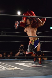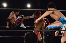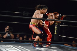 遠藤ドロップキック、高尾地獄突き(右写真)、ロープに振る、石井がエプロンからキック。石井ロープ越しのネックブリーカー、エプロンでサンドイッチドロップキック、リングに戻すと高尾カバー、カウント2。石井にタッチ。