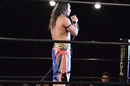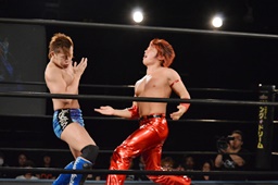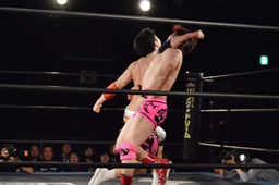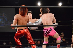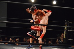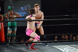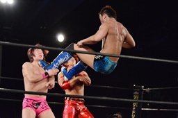 高尾ガットショット、遠藤チョップ、高尾エルボー、ロープに振ってドロップキック(右写真)、カウント2。入江にタッチ。5分経過。