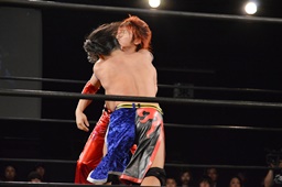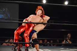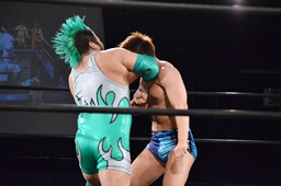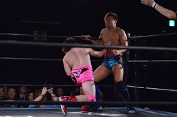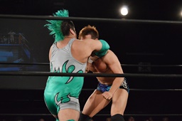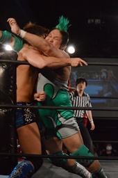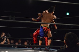 石井首投げからスリーパー、彰人切り返して腕をひねる(右写真)、石井切り返してヘッドロックからフライングメイヤー、彰人ヘッドシザーズ。高尾と遠藤にタッチ。