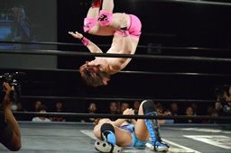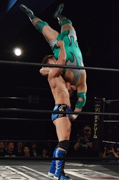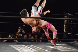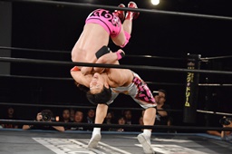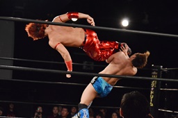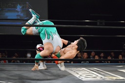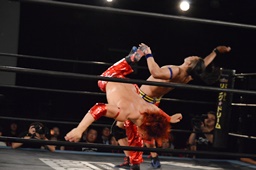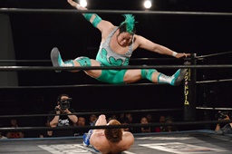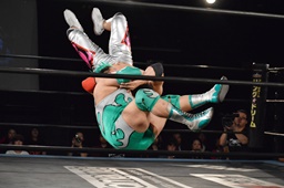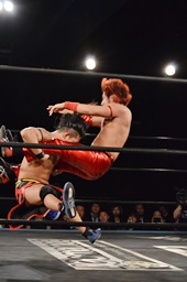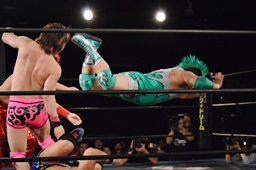 ボディスラムからサマーソルトドロップ(左写真)、カバーは竹下がカット。入江が竹下を場外に出す。石井は高尾にタッチ。