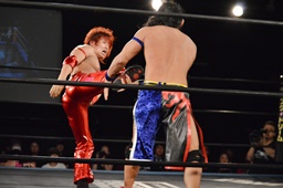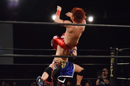 彰人コーナーに振って突っ込む、高尾トラースキック(右写真)、背中にフットスタンプ。