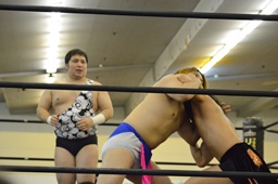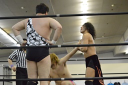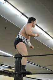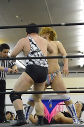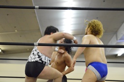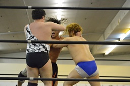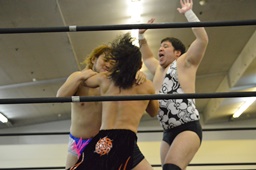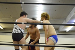 ニラは行方不明。ディーノと高梨はアントンを無視して2人ロックアップ(左写真)、ディーノコーナーに詰める、ブレーク。