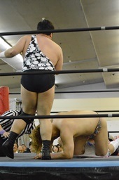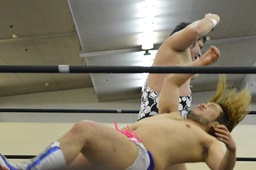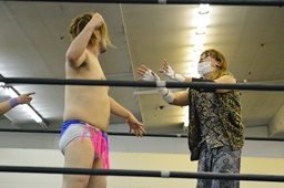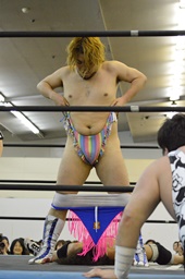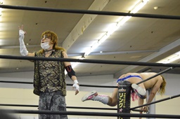 ディーノリバースえび反りジャンプ狙って後ろ向きにコーナーに上る、ニラ起き上がってカンチョー(右写真)。ディーノ動じず。