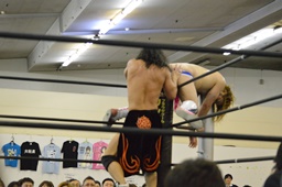 ダイビングフィストドロップを狙ってコーナーに上る(右写真)、
