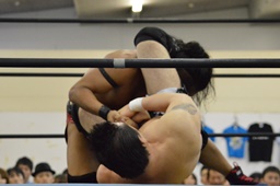 高木クローズライン(右写真)、シットダウンひまわりボム狙うが彰人が阻止。