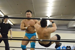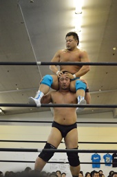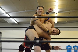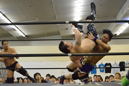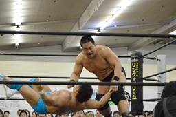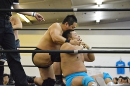 ヤマケンハイキック、彰人かわして低空ドロップキックから俵返し(右写真)、松永にタッチ。