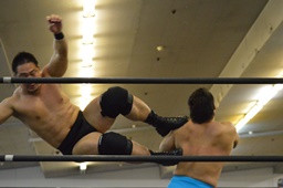 彰人が足を取るがヤマケンは藤原ばりの「極まってない」ジェスチュア(左写真)。ヤマケンアキレス腱固め、彰人クロスヒールに返す、ヤマケン切り返す、彰人ロープ。両軍タッチ。