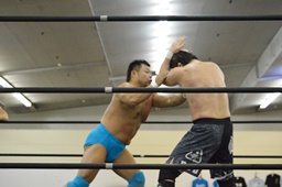 ロックアップ、松永ヘッドロック、高木ロープに振る、ショルダーブロックの打ち合いは松永の勝ち(右写真)。