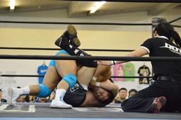高木首投げからチンロック(右写真)、チキンウィングに。松永切り返すが高木はすぐに元に戻す。