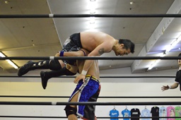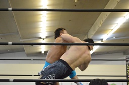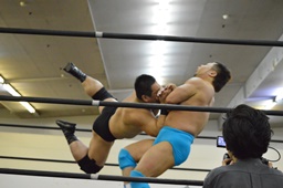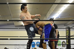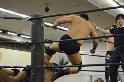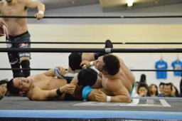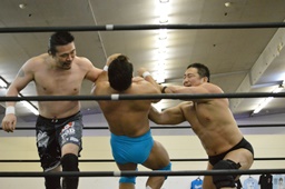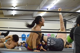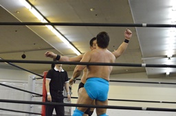 ヤマケンも彰人にグランドクロス200(右写真)。松永がロープ。高木コーナーに振って突っ込む、松永カウンターのキック、ボディスラム、彰人にタッチ。