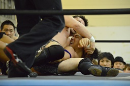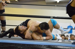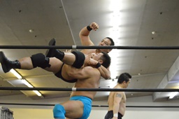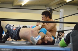 先発はヤマケンと彰人。ヤマケンタックルからバック取ってスリーパー、十字狙う、彰人ブロック(右写真)。