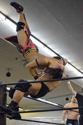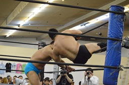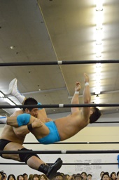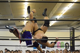 彰人コーナーに上る、高木下からドロップキック、エプロンに落とすとぶっこぬき雪崩式ブレーンバスター(左写真)。ヤマケンにタッチ。