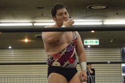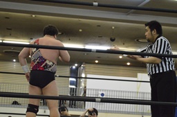 佐々木「ノド乾いた!」と水を飲む(右写真)。実はわさびエクレア食べてたんじゃないかという疑惑起こる。佐々木ターンバックルにぶつけてパンチ連打。15分経過。