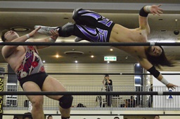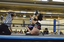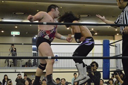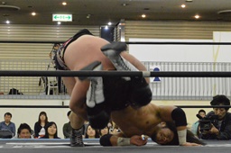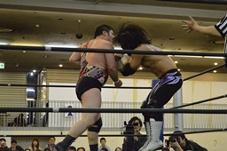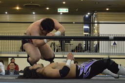 アントンロープに振る、佐々木切り返してドロップキック(左写真)、カウント0。