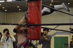 アントンコーナーに上ってダイビングフィストドロップ、佐々木かわす(右写真)。