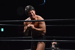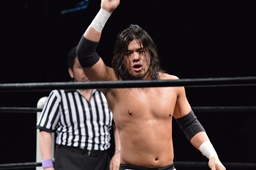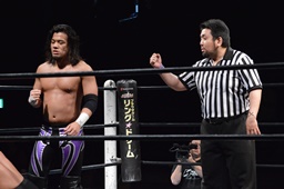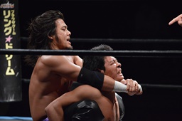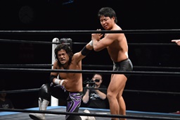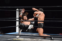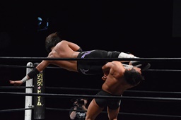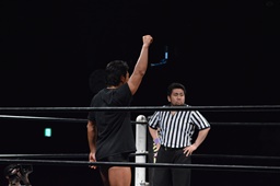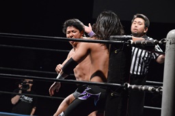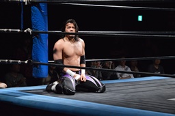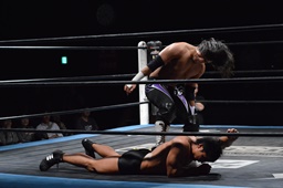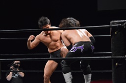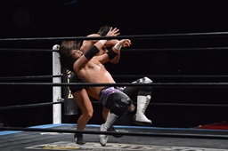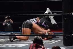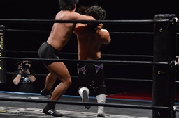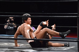 ロックアップ、宮武ガットショット(右写真)、ヘッドロック、佐々木ロープに振る、宮武ショルダーブロック。
