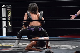 逆さ押さえ込み(右写真)、カウント2。スクールボーイ、カウント2。