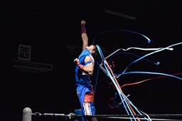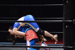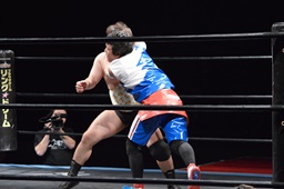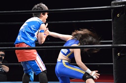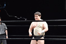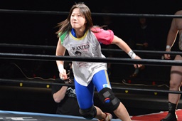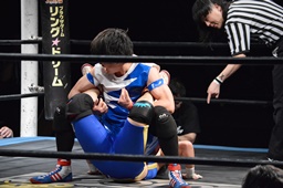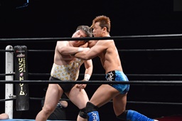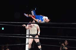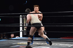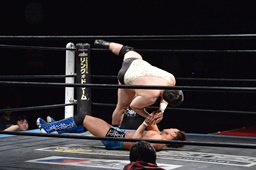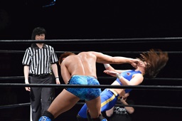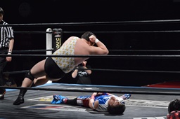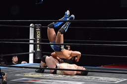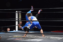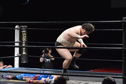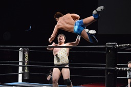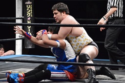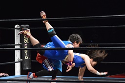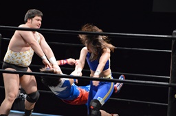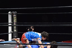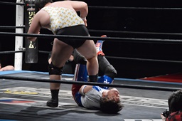 勝俣切り返してヘッドロックからフライングメイヤー(右写真)、帯広ヘッドシザーズでブレーク。両軍タッチ。