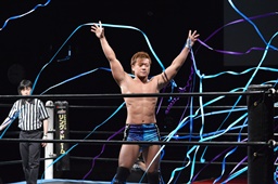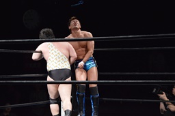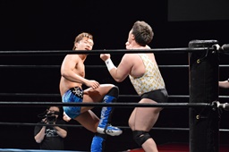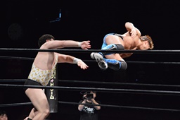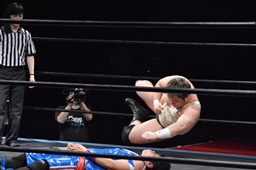 遠藤その場跳びシューティングスタープレス(右写真)、カウント2。