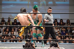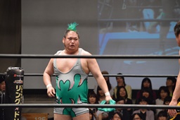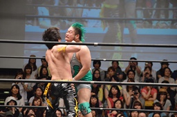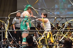 入江の入場テーマが「タチムカウ〜狂い咲く人間の証明」から途中で高井憲吾の入場テーマ「MIGHTY WINGS」に変わる。師匠思いだなあ。