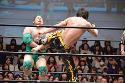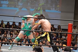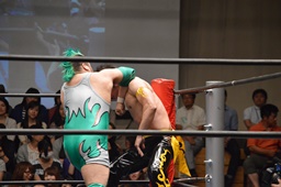 KUDOがロープに飛ぶ、入江は斜めの方向からショルダーブロック(右写真)、コーナーまで吹っ飛ばす。