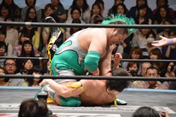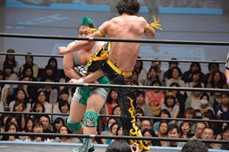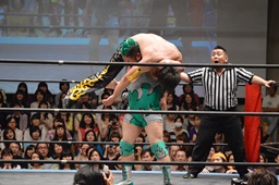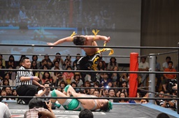 入江ロープに飛んでビーストボンバー(右写真)、カウント2。