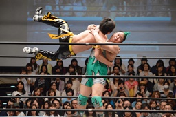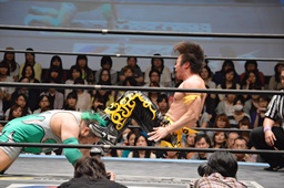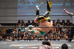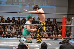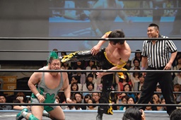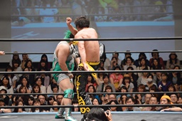 KUDOニーリフト、ロープに飛ぶ、入江キャッチしてブラックホールスラム(左写真)、カウント2。