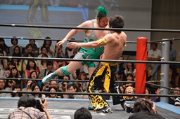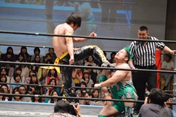 入江ロープに飛ぶ、KUDO延髄蹴り(右写真)。