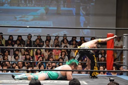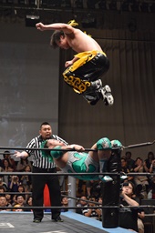 KUDOコーナーに振って8×4、コーナーに上ってダイビングダブルニーアタック(右写真)、カウント2。