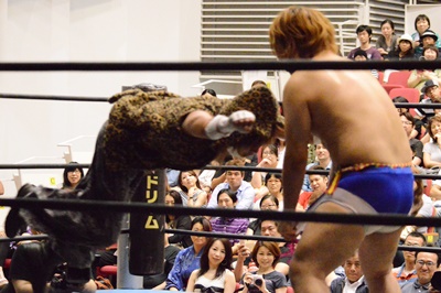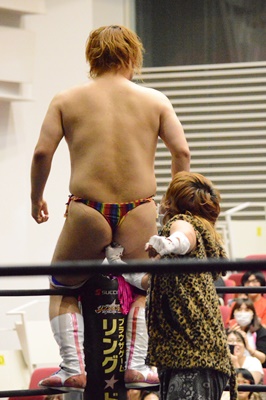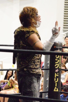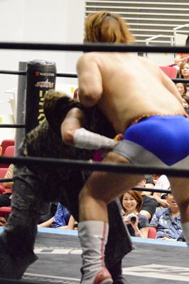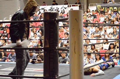 コーナーに上ってアピール(右写真)。この試合は両者の強い要望により3カウントフォールなし、ギブアップなし、場外カウントなし、反則裁定なし、オーバー・ザ・トップロープのみの完全決着ルール。