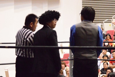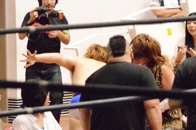 様子を見に行った松井レフェリーが「いません!」ということでGM、松井レフェリー、井上マイクリングアナが3人で審議(左写真)。審議結果は「セミファイナルを先に行います。」