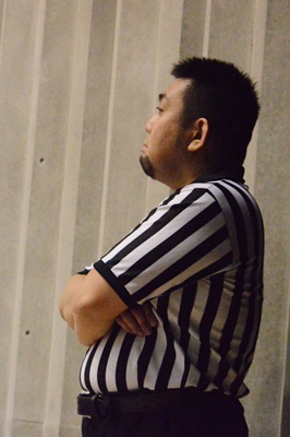 見送る松井レフェリー(右写真)。