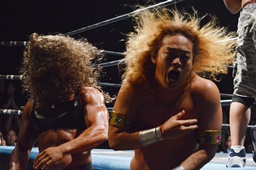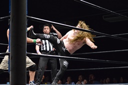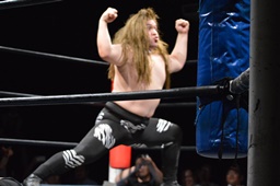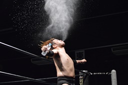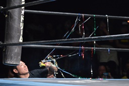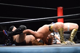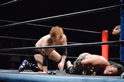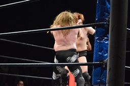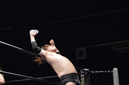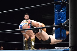 ツヨーソが福田をコーナーに振ってクロスボディ、福田かわし(左写真)、